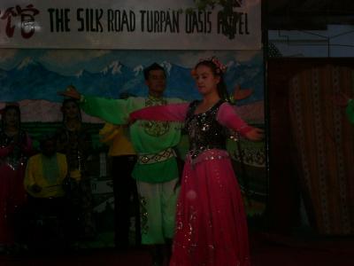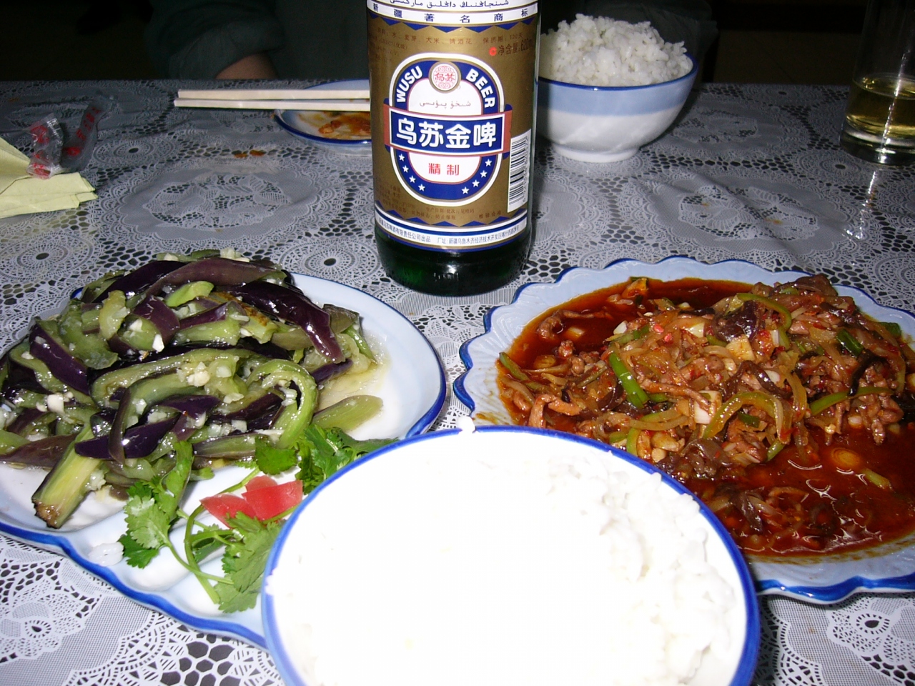 オアシスホテル前の文化路には飲食店が路の両脇に沢山ありますが、その中で美味しくて安いお店がありました。ホテルを出て路の反対側に渡り、左方向へそのまま道なりに30m程歩くとそのお店はあります。(名前を覚えてなくてすいません・・・) 店の入り口と窓に沢山のメニュー名と値段を書いたお品書きが目印。茄子のにんにく炒め、牛肉のピリ辛炒め、白飯、ビールが二人で合計19元でした。味も良く、良心的なお値段(3元~8元が中心価格)。店内も清潔で店の人もいい感じでした♪トルファンに3日間滞在しましたが、毎夕食をここで頂きました。