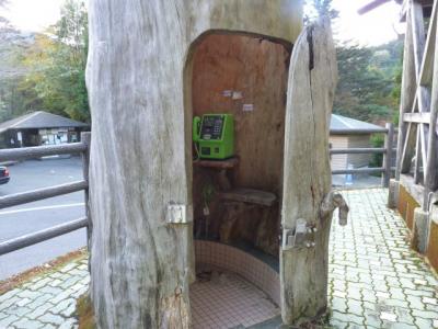 休憩所の外に有る屋久杉の電話ボックス。実際に使えて、タクシーを呼んだりできる。