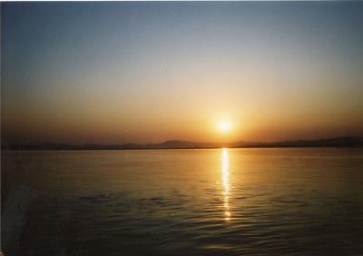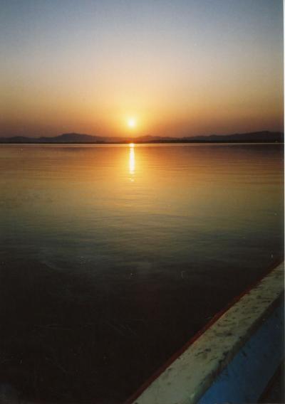 ブーパヤパゴダ近くの船着場から乗船。エーヤワディー川に映る夕日を見るた...