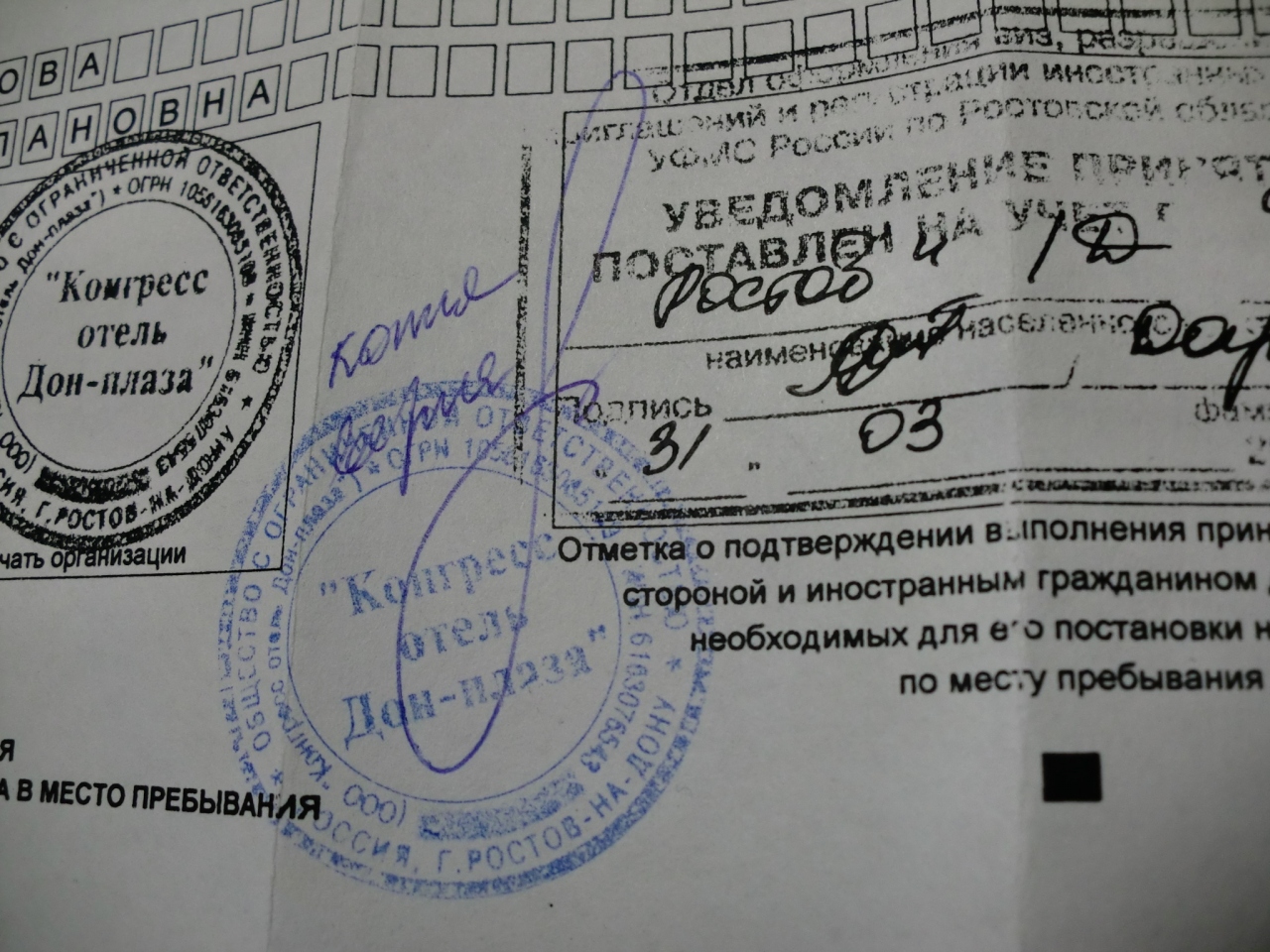 ロストフのホテルでは滞在証明を書面で発行してくれました。が、ロストフのホテルでも前の滞在証明をなぜもってないか質問されました。バウチャーのコピーを持っていたのでの控えを提示して、VISA通り滞在していると説明してから協力的なってくれました。最初は前の滞在証明がないと今回のも発行できなようなことを告げられました。