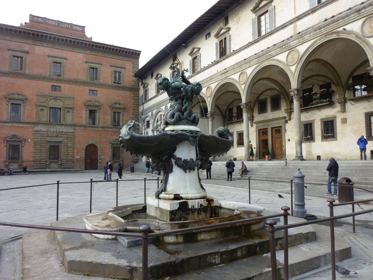 サンティッシマアヌンツィアータ教会、捨て子養育院美術館に面した広場です。騎馬像と奇妙な噴水があります。教会と美術館のアーチが綺麗です。特に観光客が集まるわけではありませんが捨て子養育院美術館へ行ったときに通りかかりました。