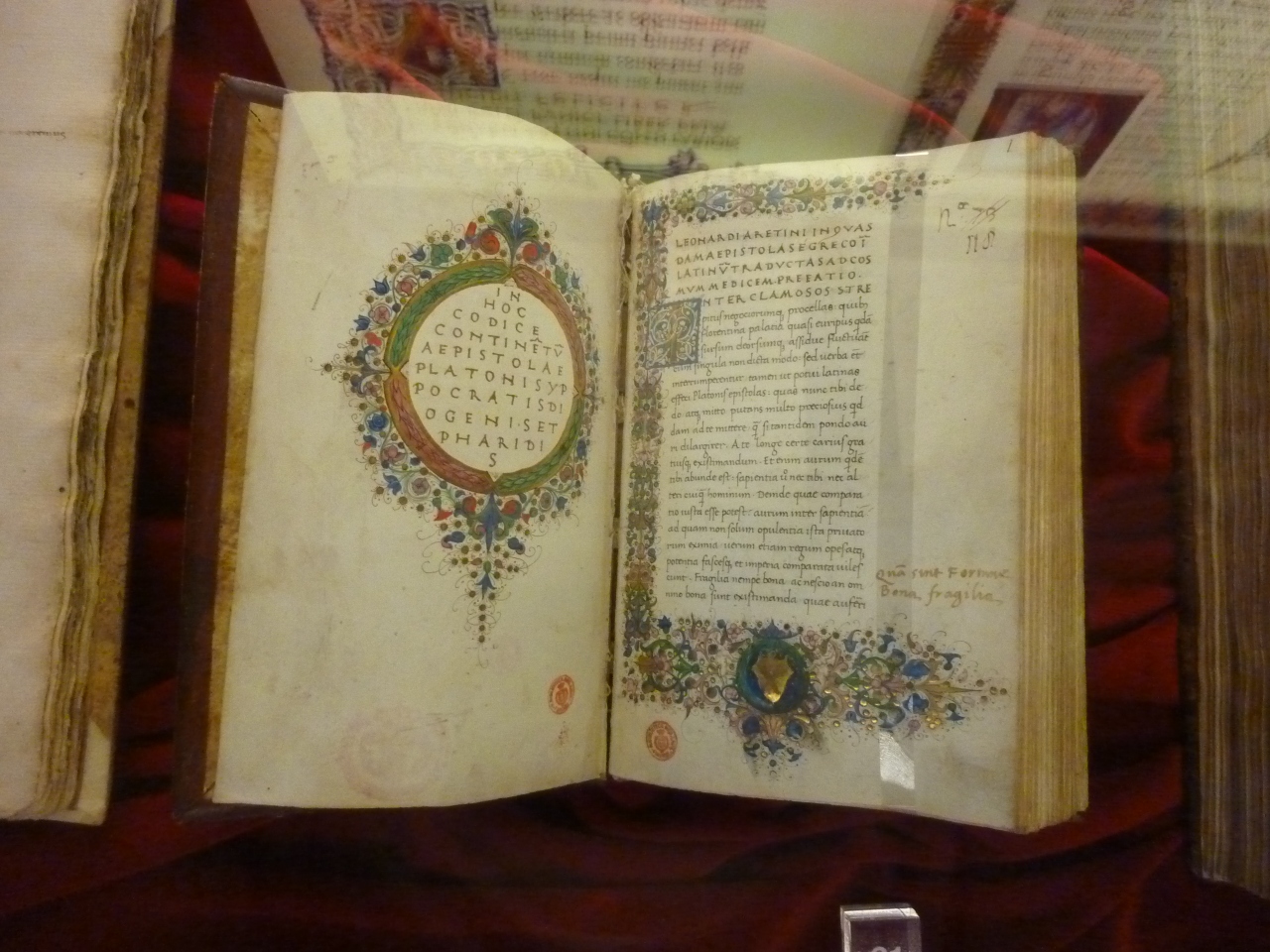 サン・ロレンツォ教会に入ると中庭を囲む回廊があります。中庭にはオレンジが実をつけていました。図書館に入る入り口にミケランジェロが設計した階段が3つあります。流れる水を表現している階段です。中に入ると椅子のある広い部屋があり、そこを抜けると古い本が展示してあります。その奥は売店です。