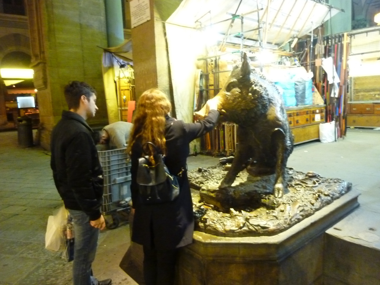 新市場のロッジアの横にあります。一度通って見逃してしまいました。観光客が集まっているのに(笑)。幸運のイノシシ像として有名なブロンズ像です。鼻をさわると幸運になるらしいので観光客が並んでさわっています。鼻がぴかぴかになっています。