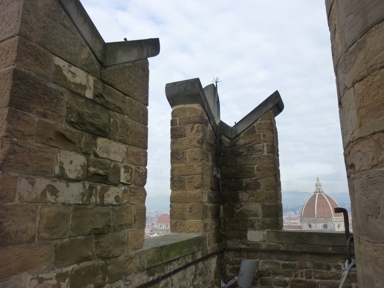 シニョーリア広場からダビデ像を横目で見てヴェッキオ宮に入ります。有名な五百人広間の壁画や天井画を鑑賞します。塔の入り口で係員にフィレンツェカードを見せます、薄暗い階段を苦労して登ると塔の周りを一周できる回廊のような場所に出ます。写真を撮ったり休んだりして、さらに上に登ります。狭い階ですがドゥオモやメディチ家礼拝堂も見えます。気持ちのいい場所です。