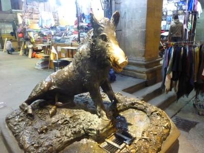 古い屋根付きの市場です。屋根はアーチ式で彫像まであります。皮製品やお土産の店(屋台)がたくさん並んでいて賑やかです。夜はなくなっています。横にはイノシシの像があり鼻をさわって写真を撮る列ができています。ウッフィツィ美術館に同じイノシシの象がありました。