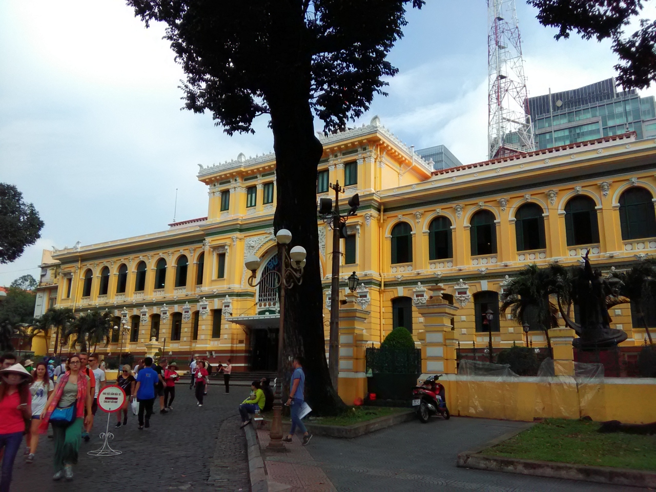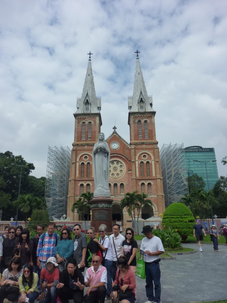 工事をしていて中には入れませんでした。離れたところから見てもきれいな建物です。正面にあるマリア像の周りで団体の観光客が集合写真を撮っていました。ウェディングドレス姿の人がいつもいます。アオザイ姿をカメラマンが撮影をしていたり、ホーチミンの名所です。中央郵便局もとなりにあるのでツアーバスがたくさん来ます。日本の高校生がバスから降りてきたのはちょっとびっくりしました。修学旅行でしょうか。
