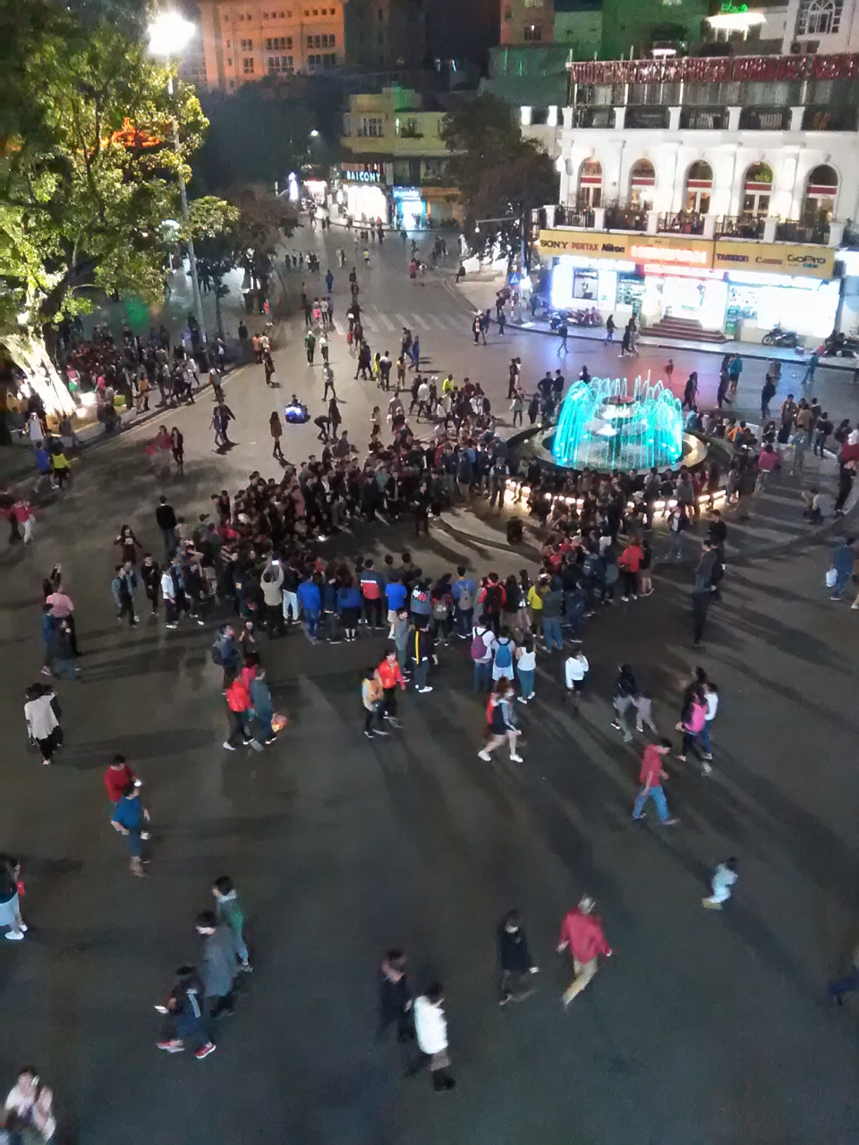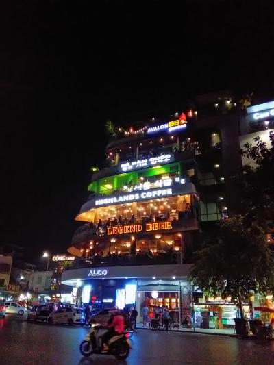 ホアンキエム湖の北側のロータリーに面しています。入口から階段を登り三階の店に入ると明るく広い店内です。カウンターでコーヒーとお菓子を注文して席を探します。外の見晴らしのいい席は満席なので室内の席に座りました。ガラス張りなので外が見えて冷房が効いていて快適です。wifiもありました。