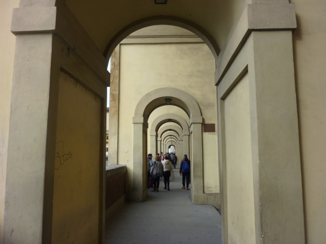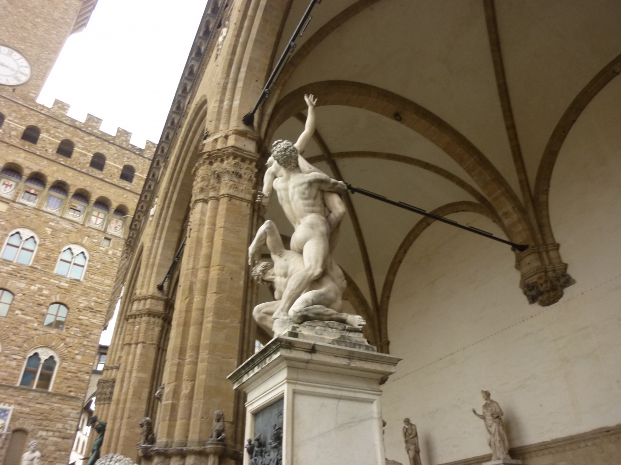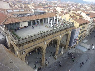 彫刻がたくさんあります。屋根があります。屋根の上はウッフィツィ美術館のカフェのテラスにっています。彫刻の名前を一つも知りませんでした。ヴェッキオ宮の入り口に立っているダビデ像しか名前がわかりません。帰ってきてから写真を見て彫刻を調べています。