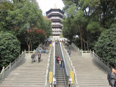 西湖十景の一つです。大きな寺の境内を歩いて行くときれいな塔が見えます。門で料金を支払い、しばらく歩き坂を登るとエレベーターがあります。下には古い土台が保存してありました。エレベーターを降りると回廊になっています。大きな塔を作ったものです。上から見る西湖は実に広々としています。夕照ということから夕陽がきれいなのでしょうか。これから歩いて西湖十景を廻ります。空気が澄んでいたらもっときれいなのでしょう。