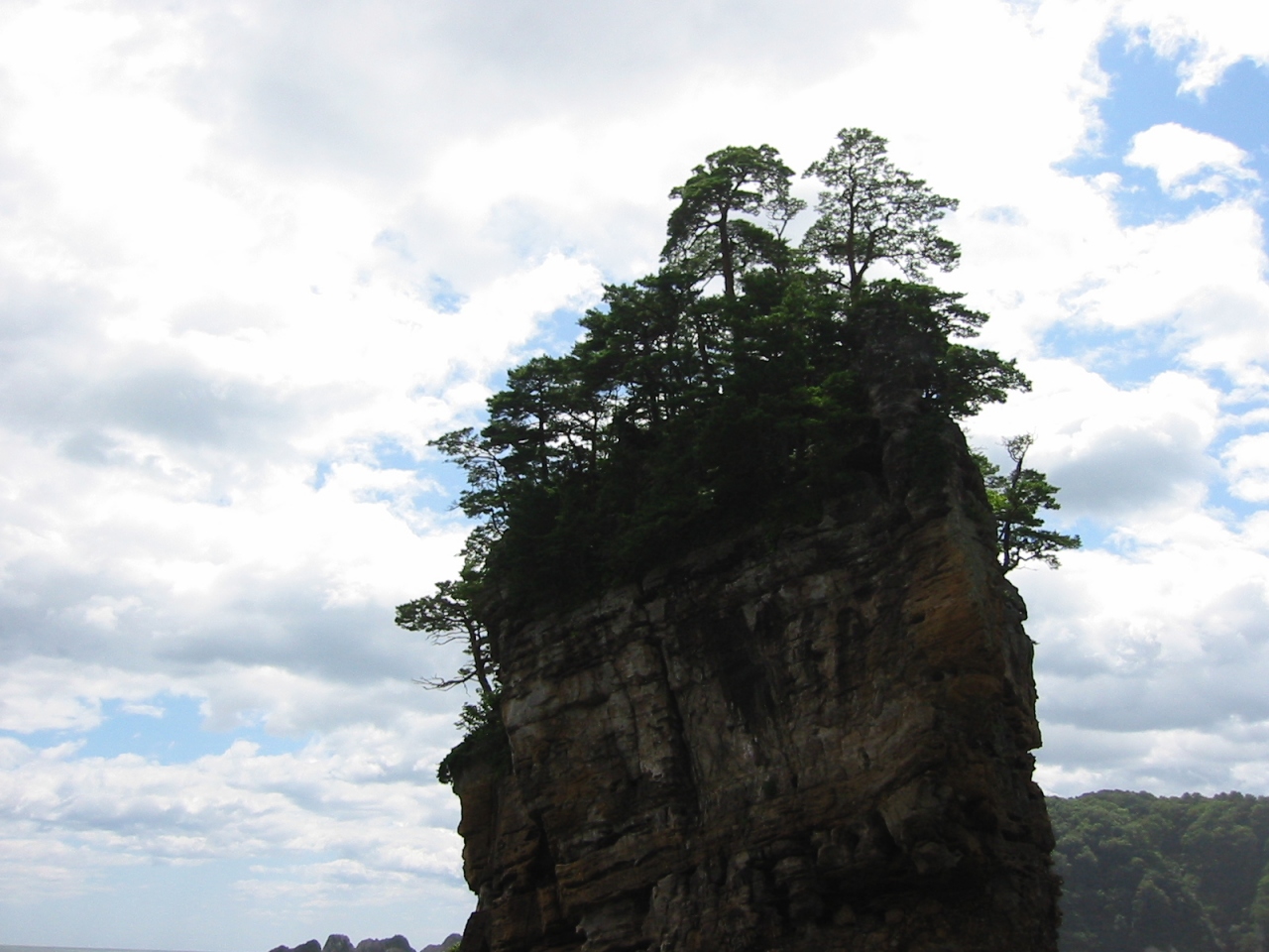 震災で被害が大きかったので近くには行けません。岩が波で浸食してできた三王岩です。三陸海岸をドライブしているとこのような岩がたくさんあります。以前は下に降りて行くことができたと聞いて残念な気持ちになりました。イワツバメの営巣地なので静かに見守りたい場所です。