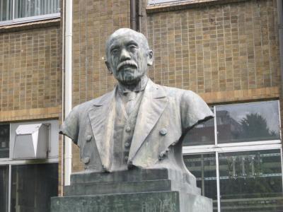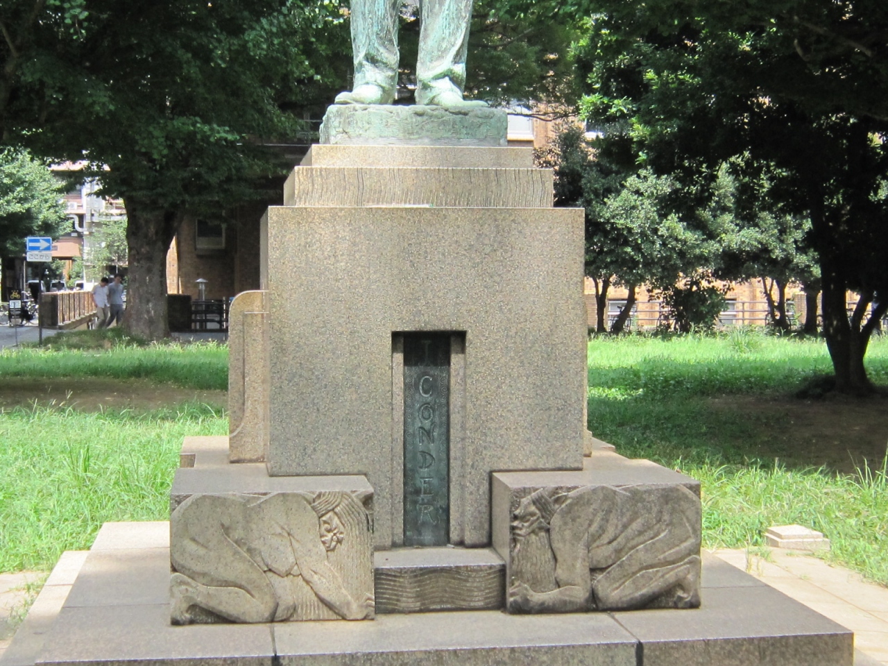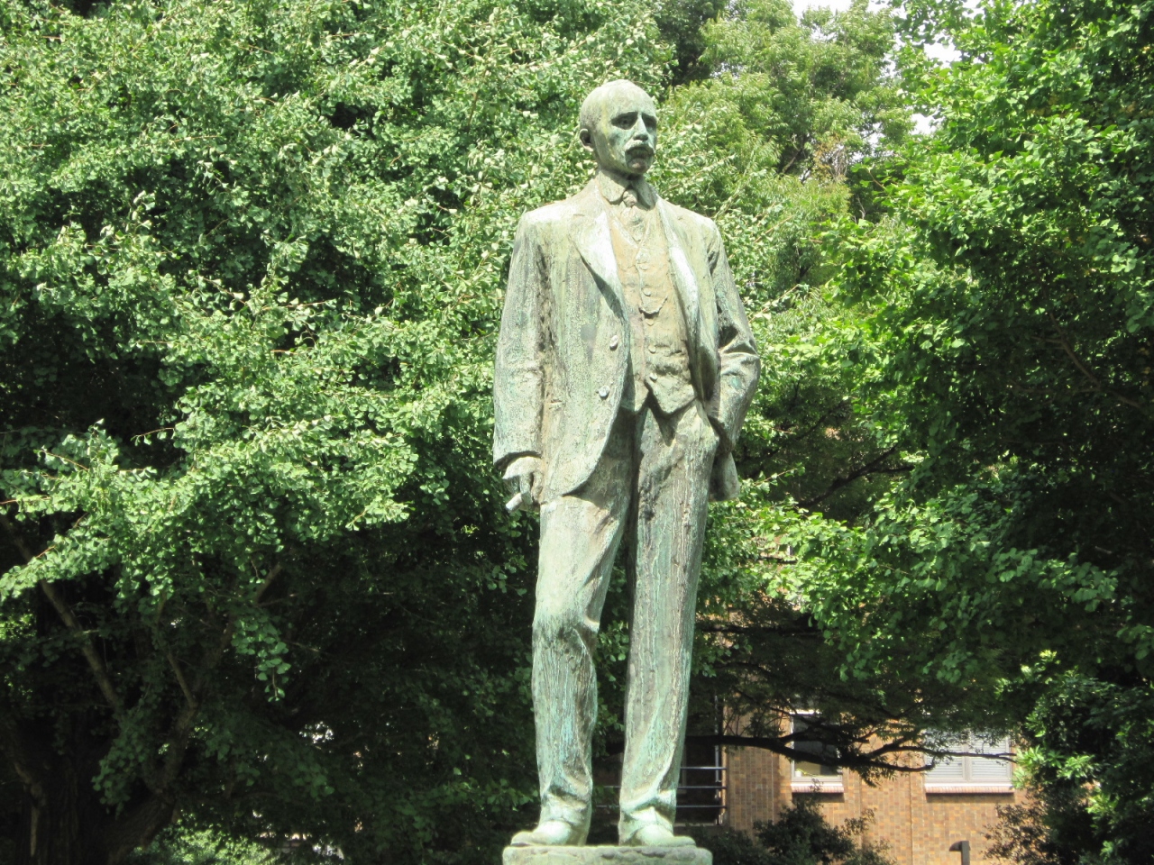 銅像は右手に葉巻を持ち、左手はズボンのポケットに入れています。とてもリラックスしているように見えます。建築家の伊東忠太がデザインし、新海竹太郎によって彫刻されました。