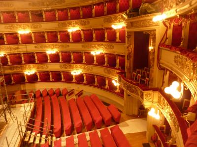 ドゥオーモ広場からガレリアを抜けるとレオナルド・ダ・ビンチの像があります。その広場の正面にスカラ座があります。大劇場の割に小さく感じました、向かって左に博物館の入り口があります。チケット売り場にはコインロッカーもあります。らせん階段を登っていくとホールがあり劇場内が見下ろせました。公演のステージ作りをしていました。博物館は作曲家の像や衣装、小道具などたくさんの展示物がありました。