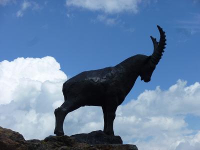 ケーブルカー2つとロープウェイ1つを乗り継いで3057mのピッツ・ネイルにきました。シンボルの山羊が黒々としています。下では雨が降っていましたがここは青空が見えて風もなくラッキーでした。3千mなので息苦しいかと思いましたが大丈夫でした。おすすめは窓からアルプスが見えるレストランです。