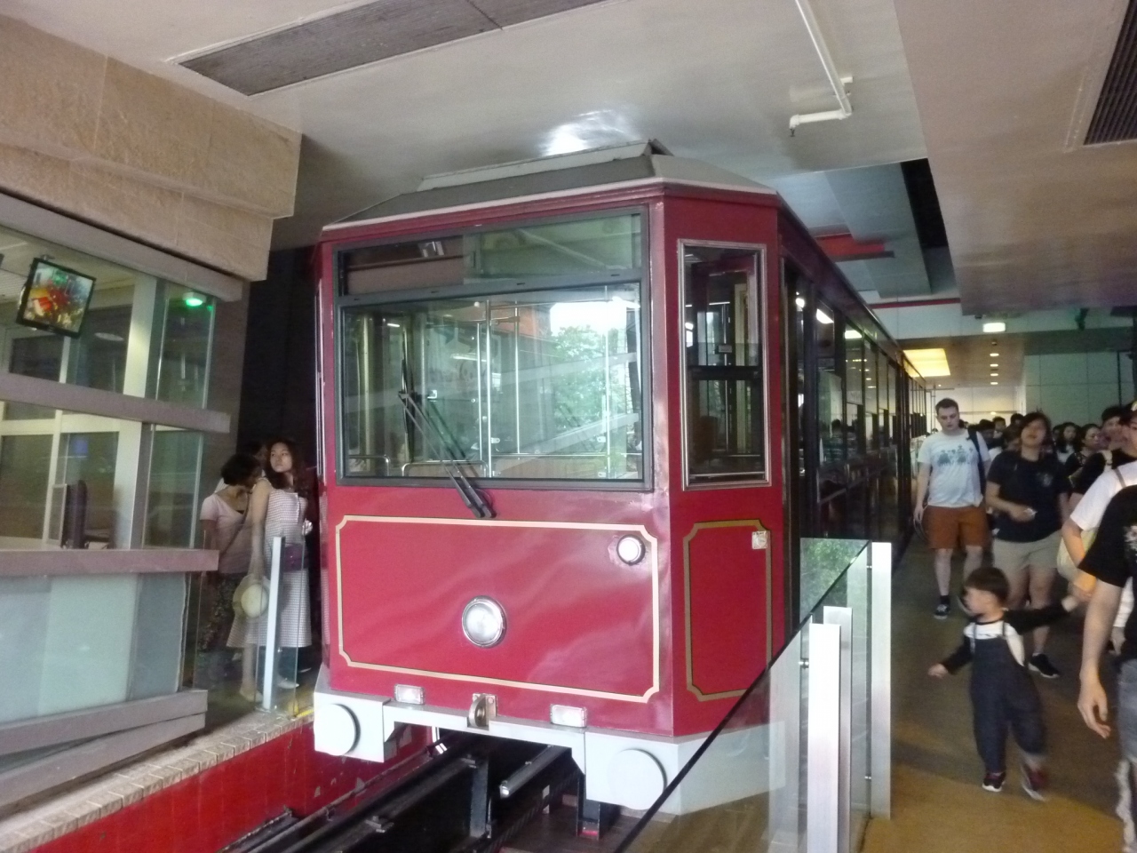 香港の観光で一番行きたかったところです。今回は昼間でしたが次回は夜景を見たいのでもう一度来ます。中環駅のJ2番出口から歩いてピークトラムの乗り場まで行きました。案内板が矢印で方向を示しているので迷うことはありませんでした。平日ですがチケットを買う人の列ができていましたがオクトパスカードでスイスイ入れました。ケーブルカーの景色がいいのは右か左か係の人に聞くと右という答え、一列車遅らせて入り口に先頭に並びます。ダッシュで窓側に座れました。ケーブルカーが動き出すと高層ビルが右後ろ方向に見えます。体をひねって写真を撮りました。