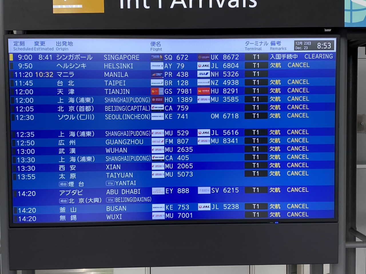 海外からの到着便はシンガポールからとマニラから、ダラスからの3便だけです。