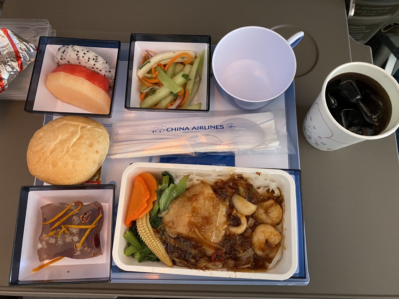機内食は、エコノミーと同じですがなんとなく得した気分でした。- 旅行時期