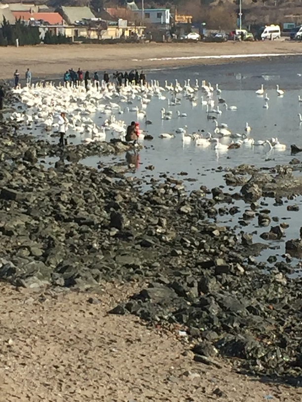 お昼の食事前に、取引先社長から白鳥がたくさん来ていっるから見に行こう。