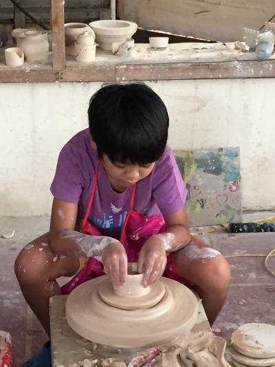 歩いていると、子供が一人ロクロを回し作品作りをしていました。