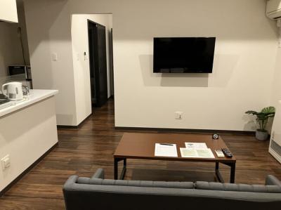 ソファエリアとキッチンエリア。キッチン用具はオンデマンド(無料)。