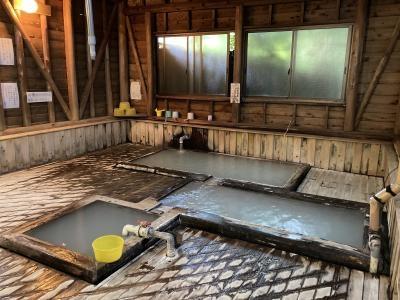 もう諦めて温泉入るか。この日は宿泊客は私以外男性2人の模様。よって女湯は常に貸し切り!最高か。3つある浴槽は硫黄泉(熱め)、微炭酸泉(冷泉)、真ん中が混合泉(ぬるめ)。これを行ったりきたり、最高すぎる。