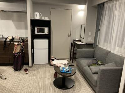 お部屋は広々、リビングエリア、簡易キッチン、レンジもある。