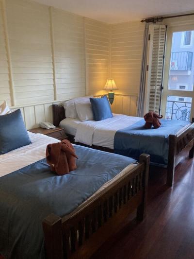 おお、なんて素敵な部屋!!窓もあって明るいし、とてもきれいで広々としたお部屋。タオルが象さんなのもかわいい。