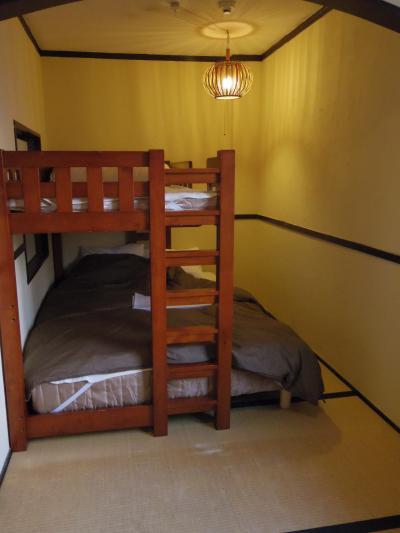 公会堂前近くの川沿いにあるホステル、AKARIに到着。子連れでホステルなんてどうかなと思ったけど、電話で問い合わせたら大丈夫というので決定。昔はラブホだったっぽい感じの建物をおしゃれに、モダンに改装。ダブルベッドとシングルベッドの2段ベッドがある個室をシングルユースで3990円。添い寝は無料。バストイレ付。元ラブホ?なせいか壁は厚めで隣の声が気にならないのが子連れにはありがたい。もちろんキッチンもあるので、離乳食の温め等にも使える。