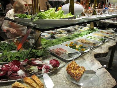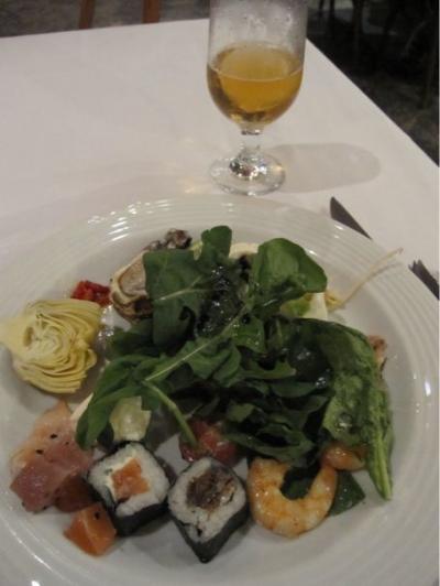 まずは前菜類のビュッフェ。すごい種類!前菜だけで十分かも。前菜以外にパエリヤやムケカというシーフードのシチューもある。そして生ガキや刺身、寿司もあった!