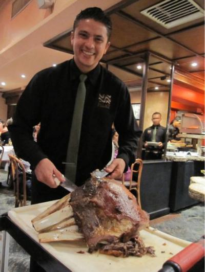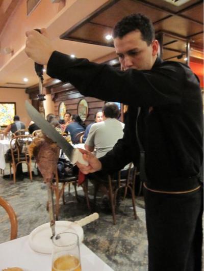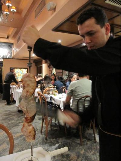 シュハスコ開始!イケメンのお兄さんがおいしそうなお肉を持って持って回ってくる。そして目の前で切り分けてくれて、それをピンセットみたいなものでつまんで受け取る。俺の肉を食え、ってかんじでなんかセクシー。