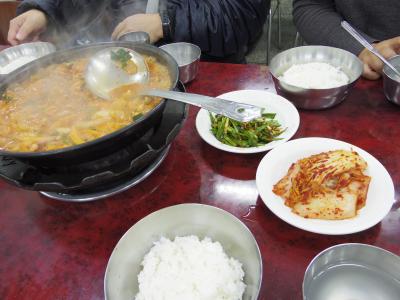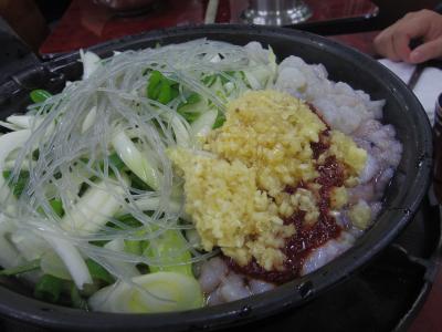 ナクチポックンというと、酒のつまみのタコの辛い炒め物だけど、釜山のナクチポックンは鍋みたいな感じ。タコと海老のミックスを注文、一人前W6500(500円強)でご飯付。にんにくがどっさり。