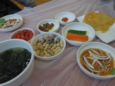 パンチャンはちょっと変わった感じ。野菜スティック、ピーナッツ、ウズラの卵、わかめスープ、にんじんのジョンなど。