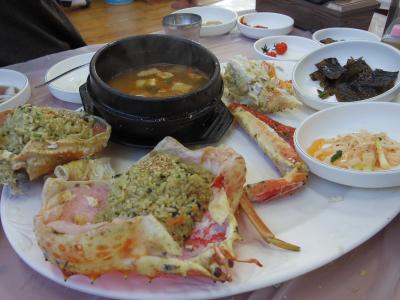 釜山の蟹で有名な機張市場へ。日本語が少しできるお兄さんが見せてくれた立派なタラバガニ。このお店キジャンテゲトメで、このタラバガニを食べることにした。