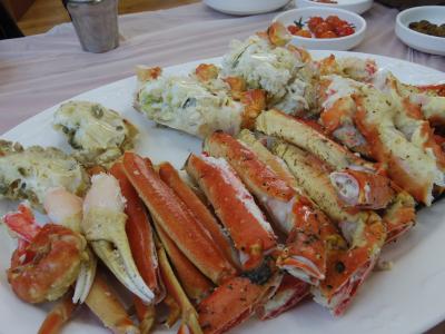 タラバ蟹を一杯、ズワイガニを1杯で合計3キロ程度、W111,500(約8800円)注文した。タラバガニが高いので、ズワイガニだけならもっと安く済む。カニを選んで蒸してもらう間30分ほど待つ。