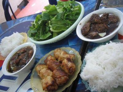 ブン・チャーとは焼肉の入った甘酸っぱいたれに、細い米麺と野菜をたっぷり入れて食べるもの。揚げ春巻き(ネム)と一緒にいただく。写真のとおり野菜てんこ盛りでものすごいボリュームでうまい!!たれがなんともいえない甘さ&すっぱさでうまいんだ。にんにくとチリを入れるとなおよろしい。これでたったの200円強とは!