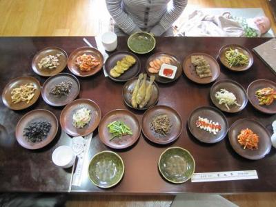 韓定食で有名な青受亭へ。 ここも伝統的家屋がレストランになっていて、オンドル部屋でいただく韓定食は最高!どうしても高くなってしまう韓定食だけど、ここは1万5千ウォン(約1200円)と良心的だし、他の韓定食やさんにはない名物のムール貝の炊き込みご飯(ホンハッパッ)がついてくるのだ。おかずはずらりと17種類。