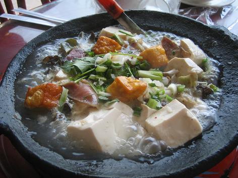 大理はペー族(白族)という少数民族が暮らす町で、白族のレストランが沢山ある。どこも店頭に沢山の野菜と湖で取れた魚を入れた生簀がおいてある。 中でも有名な砂鍋魚という料理を食べてみることにする。小さいサイズで30元。単価は安くないけど、そもそも一人で食べるものではないのでものすごいボリュームなのだ。しかも野菜たっぷり、小さい鯉も3匹入っていて、この値段はむしろ安い。いろんな野菜やきのこ、豆腐が入っているのがすごくありがたかった。