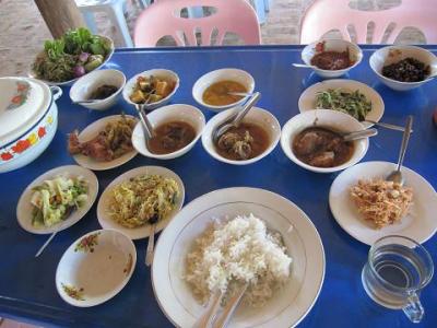 ガイドブックにものっているバガンのゴールデンミャンマー2というレストランでミャンマー料理のビュッフェ。3000チャット(300円)。ここ、トイレはきれいだし、サービスもいいし、3000チャットで出てくる品数の多さは圧巻!テーブルにずらりと並ぶこのおかず、全部私のもの。しかもこれがおかわり自由なのだ。すげー。