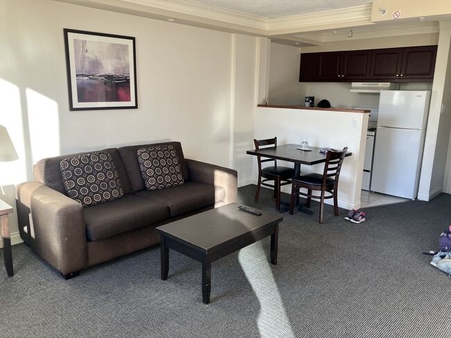 Century Plaza Hotel。ハイアットから歩いて15分くらい南下したところ。箱が古くて、ハイアットからだとダウングレードではあるけど、広いし、キッチンがあるのいい!