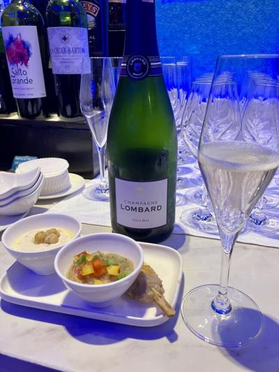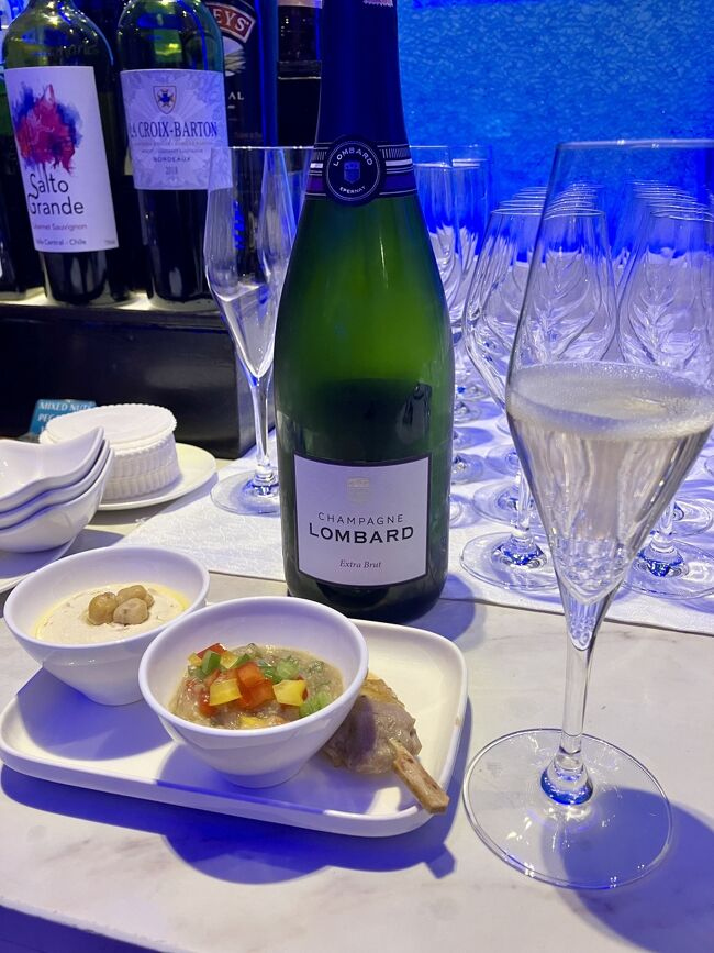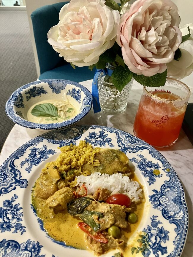スパークリングワインとソムタム、グリーンカレー、トムヤムクン、いただきます。ラウンジなので辛さ控えめだけど、味は本格的だし、具がゴロゴロ入っていてレベル高い。