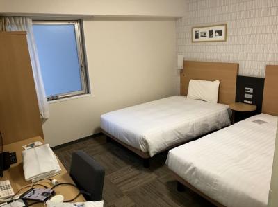 ツインルーム。日曜泊だからか7,800円と安くて、さらに各種割引で6,800円に。小学生まで添い寝無料で、朝食もつくしありがたい。