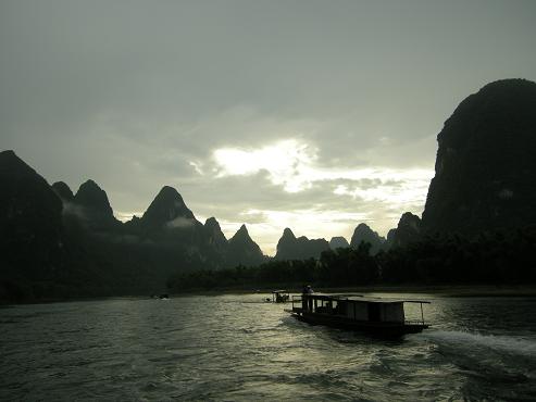 桂林から陽朔の川くだりは高いし時間がかかるので、陽朔をベースにして同じ宿の人たちとシンピンから出ている1時間の川くだりツアーに参加することにした。シンピンからの川くだりはハイライトだけで値段も10分の1の40元。ボートも小さめ。陽朔のバスターミナルからシンピンまで約40分、料金は5.5元(約80円)。シンピンからはトゥクトゥクみたいな車(2元)で河岸まで行く。