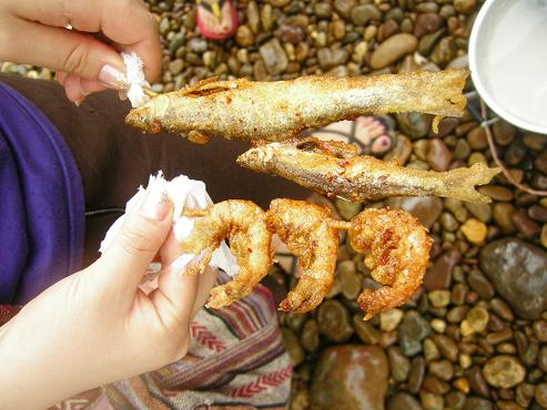 中国は桂林−陽朔の川くだりで有名なリ江にて。川くだりの途中上陸した島で魚の揚げ物(2元=約30円)を買って食べた。柔らかくておいしかった!頭ごといただきます。ちょっと辛めのたれをつけていただく。あと、小さなかにもいただいてクランチーな歯ごたえがおいしいかったけど味はまあまあ。かにも値段は同じ。