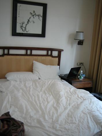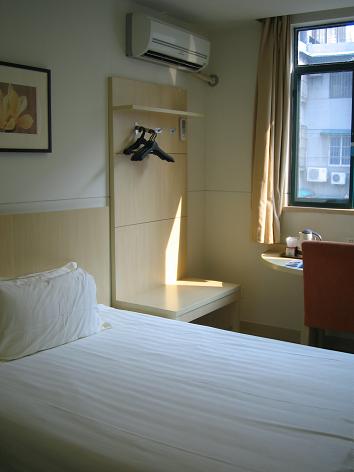 広州Liwan地区にあるビジネスホテル風なホテルチェーン、Jinjiang Inn。シングルは169元(約2500円)だった。オンライン&リピーター割引などもあるらしい。外見もきれいならば中もとってもきれいで、まだ新築なのだろうか。部屋はシンプルだけどモダンで、日本のビジネスホテル並みの設備。TV、お茶セット、蚊取り線香などがある。しかもベッドはダブルでとってもきれい。無料ブロードバンドももちろんついていた。バスタブはないけどきれいで機能的なバスルーム。