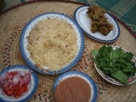 マンディは羊肉をスープでゆでてから、アルミフォイルに包み、炭火の中で一晩蒸し焼きにするハダラマウト地方の料理らしい。このお肉をご飯の上に散らばせて、トマトサルサや紫たまねぎと一緒にいただく。かなりはまるうまさ。どの店も2人分で1200-2000リヤルと高め。昼しかやっていないので注意。