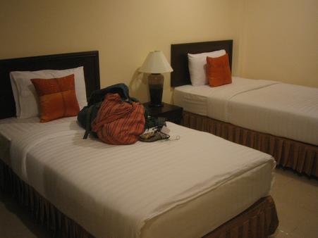 スワンナプーム空港からタクシーで約10分のところにあるバジェットホテル。空港からメーターで300バーツ弱。ホテルシャトルは毎時150バーツである。一番安いシングルは900バーツ。バジェットホテルの割には立派で、部屋もとてもきれいでインテリアもなかなかおしゃれだった。しかもツインルームなので広々、得した気分。バスルームは狭くてシャワーのみだけど、熱いお湯が出るし、清潔。TV、冷蔵庫、コーヒーメーカー、無料の飲料水も完備。エアコンもがんがんに効く。ただし飛行機の音は結構聞こえる。ホテルにレストランもあるけれど、ちょっと歩けば屋台や食堂がいくつもある。セブンイレブンも近くにある。部屋からは目の前の川とお寺が見える。バジェットホテルのQueen’s Garden Resortは思ったよりも立派で、部屋もとてもきれいでインテリアもなかなかおしゃれだった。これで3000円は安いかもな。しかもツインルームなので広々、得した気分。