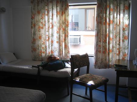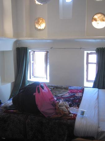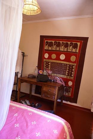 部屋は写真のような感じでちょっとアフリカ風。狭い部屋にベッドと机がひとつ、棚があるだけで簡素。バスルームも簡素だけど暑いお湯が出るのが嬉しい。ただし、部屋には扇風機しかなく、日中は結構暑い。