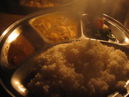 カトマンドゥのタメル地区にある安食堂Didiko Baba Bhojanalayaで晩御飯。パワーカット中だったので真っ暗な中キャンドルの光で食事。60ルピー(約100円)でお替り自由のダルバート(豆スープ、ご飯、野菜カレー、漬物のネパール定食)を食べた。安いしおいしいしボリュームもたっぷりで大満足!ネパール人が一日2回食べるというこのダルバート、かなりいいかもしれない。ダルは豆スープ、バーとはご飯の意味。それにタルカリと呼ばれるおかず(この日はカリフラワーとジャガイモのサブジ)が付く。ネパールのカレーはあまり辛くないのだけど、独特のすっぱさがある漬物がアクセントとなっておいしかった。