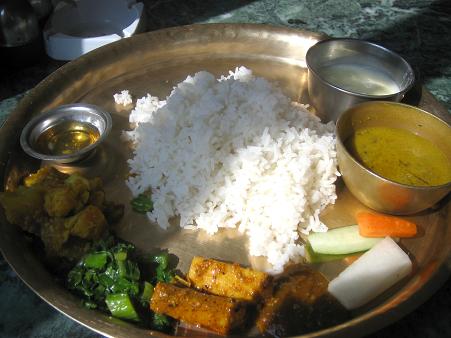 カトマンドゥ、タメル地区のタカリ・バンチャ(Thakali Bhancha)という店でお昼ご飯。歩き方にものっている店なんだけど、地元の人たちで賑わっていた。ここのダルバートは他より若干高い(85ルピー)ので、少し豪華だった。味もよかったし、しっかりおかわりした。