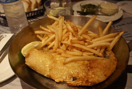 リビングストンのFawlty Towersの向かいにあるOcean Basketというシーフードのレストラン。南アフリカのチェーンらしく、その名の通りシーフードが中心。中でも有名なFish&chipsをいただいた。肝心のFish&chipsはなかなかおいしかった。衣はイギリスのに比べて薄めで、魚のボリュームがすごい。レモンをたっぷり絞っていただく。ドリンク1杯ずつを入れて2人で約30ドルとやっぱりちょっと高め。