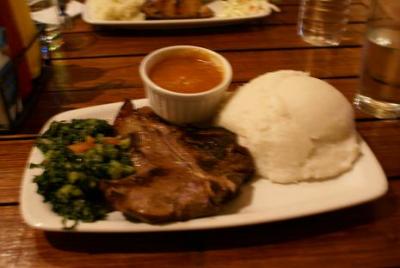 リビングストンのFawlty Towersというホステル内にあるレストラン、Hippo'sでディナー。初のザンビア料理?!と期待していたのだけど、メニューにザンビア料理はほぼ皆無だった。唯一付け合せにnshima(ポレンタのようなもの)が選べたことくらいか。nshimaはすごく素朴な味というか、ほとんど味はない。すごく腹持ちしそうなぼってりとした食感。